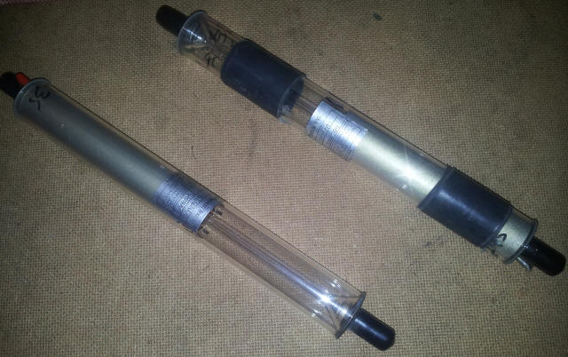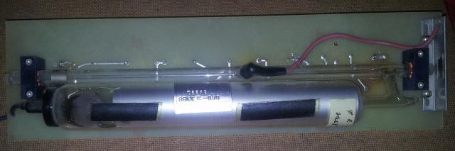 The second laser, pulled from a bin, was not in quite such good shape. The tube's getter (the desiccating and oxygen-scavenging additive, typically some reactive group 1 element) had gone, indicating the hermetic seal on the tube has failed, and the final stage bias resistor had blown. Unfortunately, this one was rightly scapped, but still, worth learning from.
