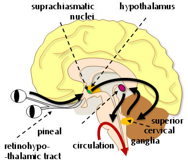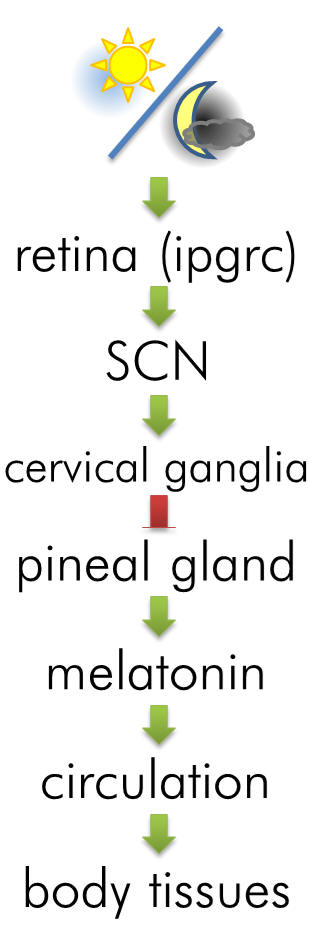 • The superior cervical ganglia is activated which in turn inhibits the release of melatonin from the pineal gland - hence light acutely suppresses melatonin release