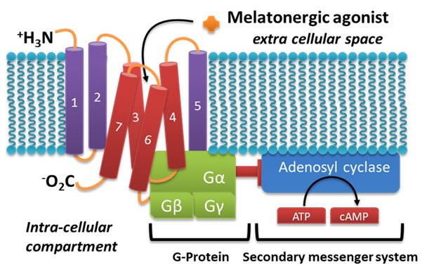 In man, the physiological functions of melatonin are mediated by its action at any of the three distinct melatonin receptors: MT1, MT2 and MT3. The latter of these is less well understood but the former are pertinent to the endocrine and central nervous system. These are typical cAMP inhibiting 7-TM G-protein coupled receptors. MT1 agonism activates protein kinase-B and is responsible for an acute neuronal inhibitory effect. MT2 agonism induces both soluble guanylate cyclase and protein kinase-C and is likely to be responsible for circadian entrainment.